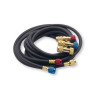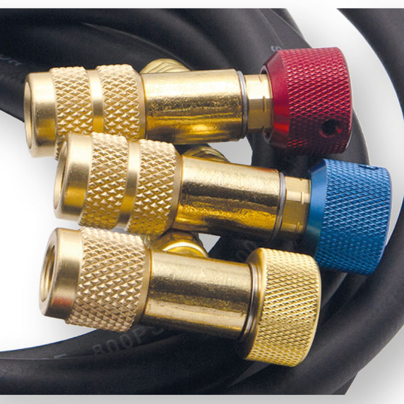 High quality professional black multi-layer rubber hose with patented, color coded Safe Seal fittings: Red for high pressure, Blue for low pressure and Golden for vacuum and charging.
