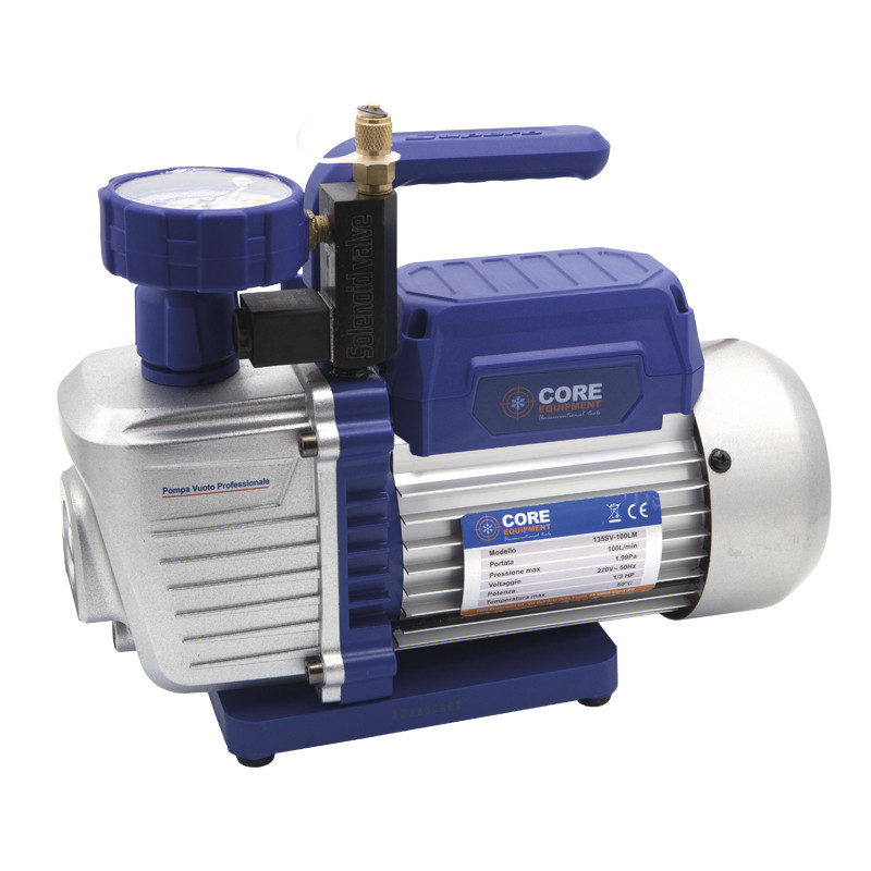 This single stage ultra high vacuum pump is of robust make with an aluminium body - high power engine and low noise level during function - ergonomic handle with built-in micro plug - practical, easy-to use oil level indicator - mounted solenoid valve and gauge. Oil included.